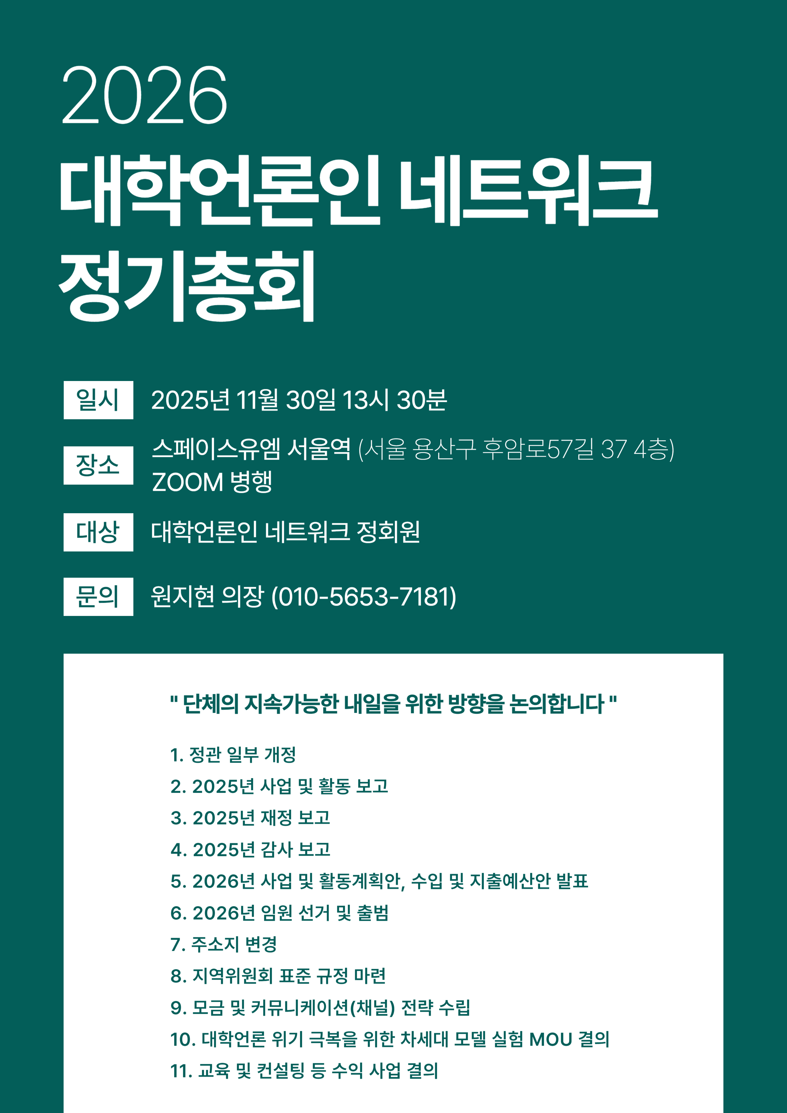 위임 의사 전달: 부득이 참석하지 못해 위임하고자 하시는 정회원께서는 "OOO(정회원 존함) 본인은 2025년 11월 30일 스페이스유엠 서울역에서 개최되는 대학언론인 네트워크 2026년 정기 총회에 부득이 참석하지 못하므로 모든 결의사항에 대하여 회의 결과에 따르기로 위임 합니다."라는 문구를 010-9923-4587(차종관)에게 문자로 전송하시면 됩니다.