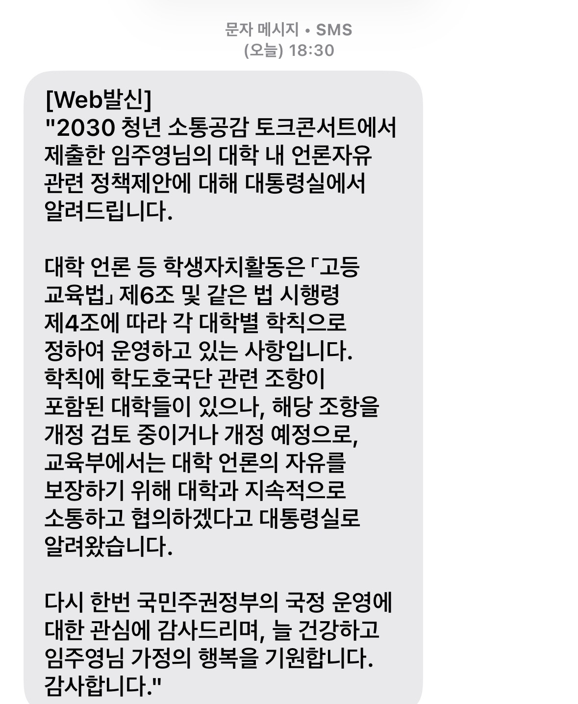 대학언론인 네트워크는 지난 9월 19일 대통령실이 주최한 2030 청년 소통·공감 토크콘서트에 참석하여 대학언론이 대학 사회에서 마주한 언론자유 탄압과 비민주적 학칙으로 어려움을 겪고 있다는 내용을 서면으로 제안했습니다.