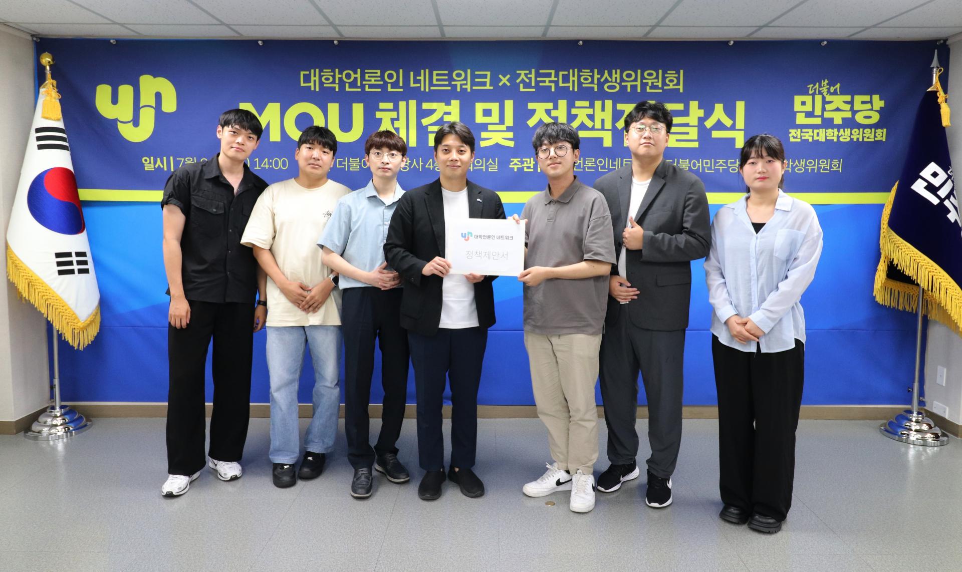대학언론인 네트워크는 지난 21일 오후 2시 서울 여의도 더불어민주당 중앙당사 4층 대회의실에서 더불어민주당 전국대학생위원회와 ‘대학언론 독립 및 대학민주주의 회복을 위한 정책협약식 및 정책 전달식’을 진행했다. 협약식에는 봉건우 전국대학생위원장, 이동원 수석부위원장, 소현호 사무국 부국장 등 민주당 관계자와 함께 원지현 대언넷 의장, 차종관 대언넷 자문위원, 김봄이 전 경기대신문 편집국장이 참석했다.